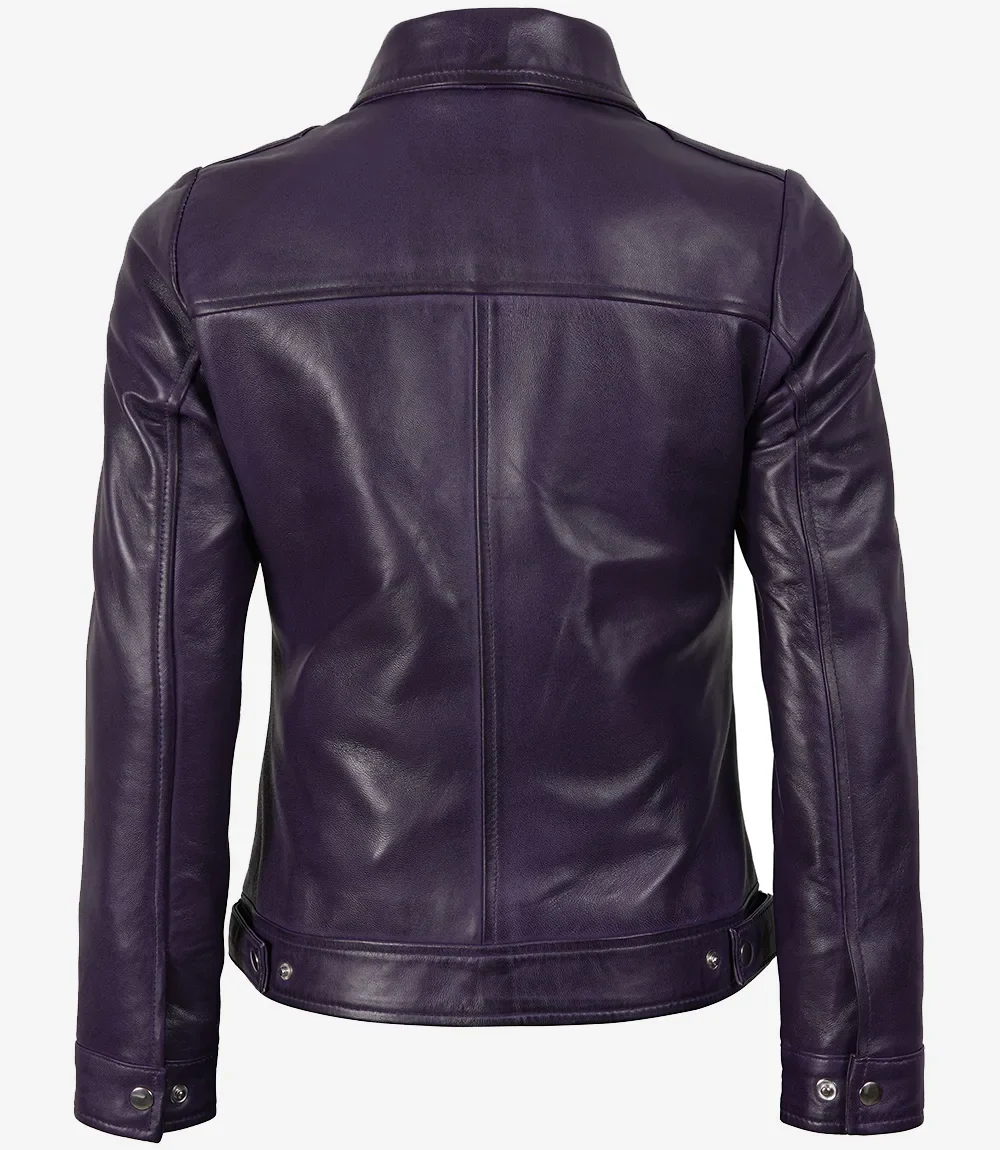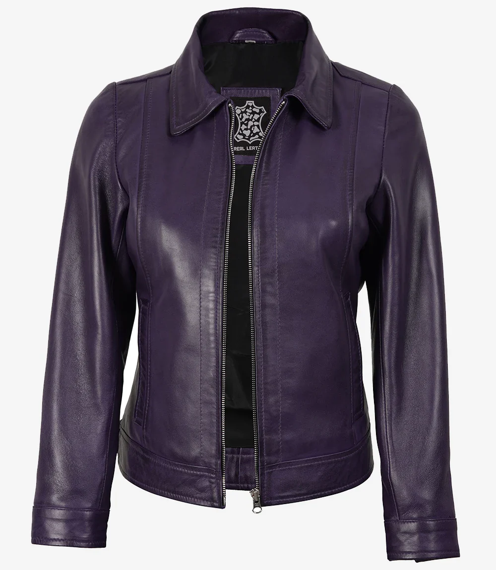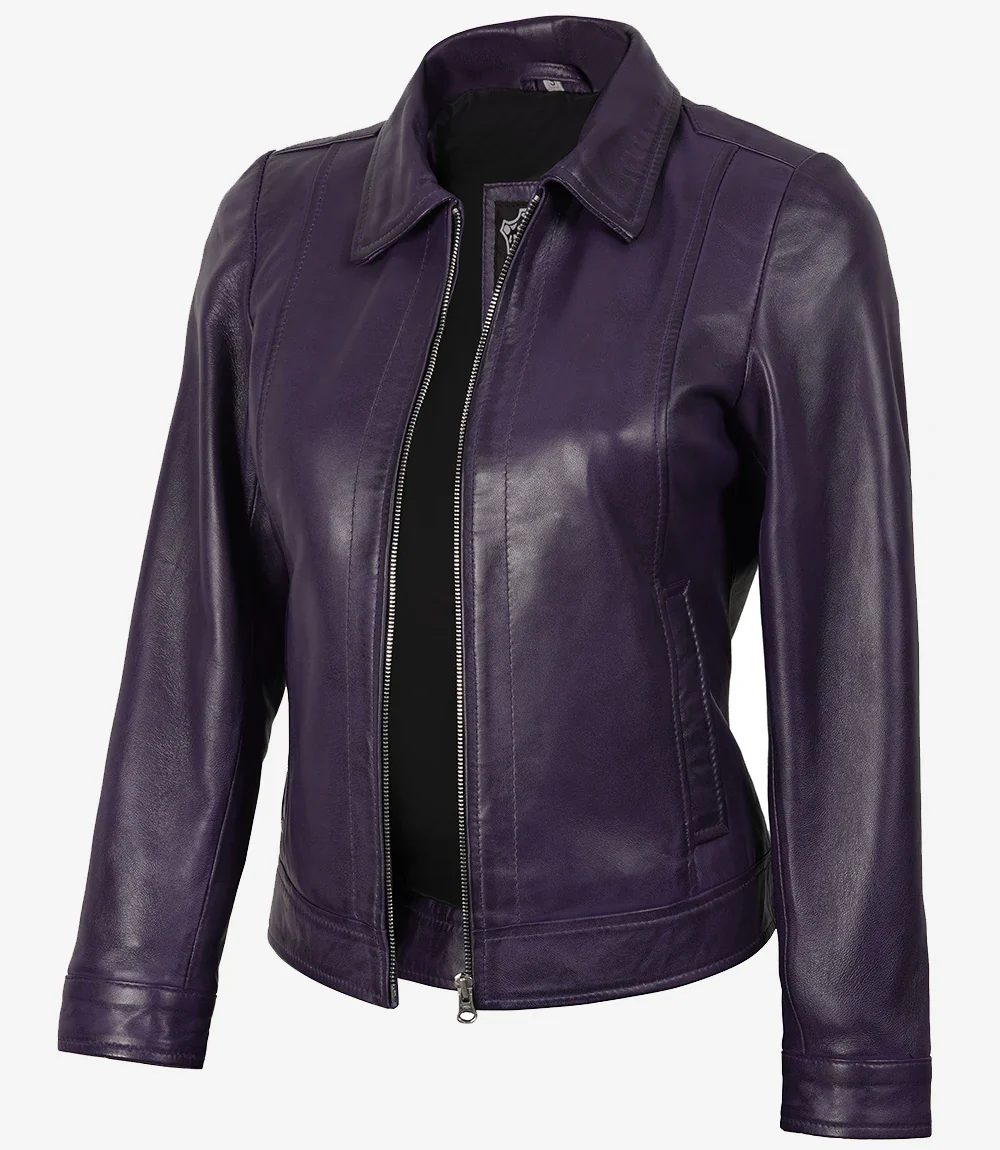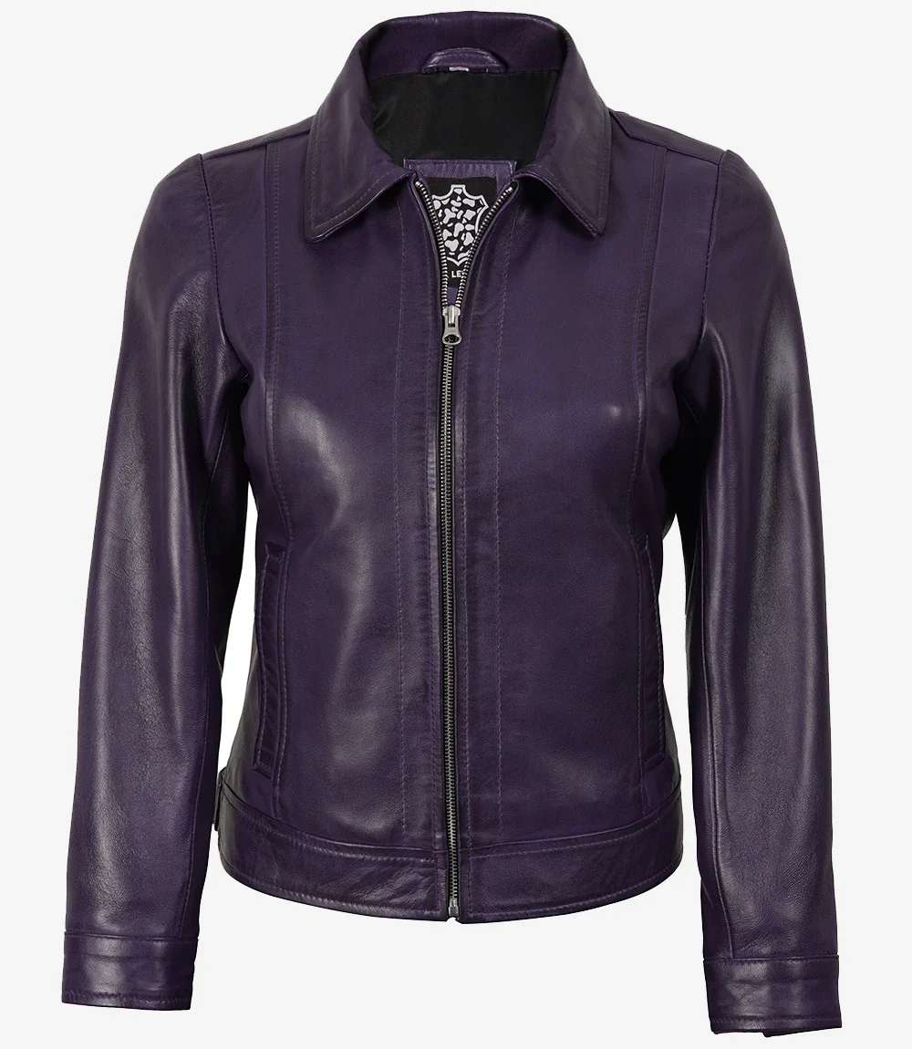 Trouvez le compagnon idéal pour vos trajets quotidiens avec cette veste en cuir violet minimaliste et classique pour femme. Confectionnée en cuir d’agneau véritable, elle est entièrement doublée de polyester doux.