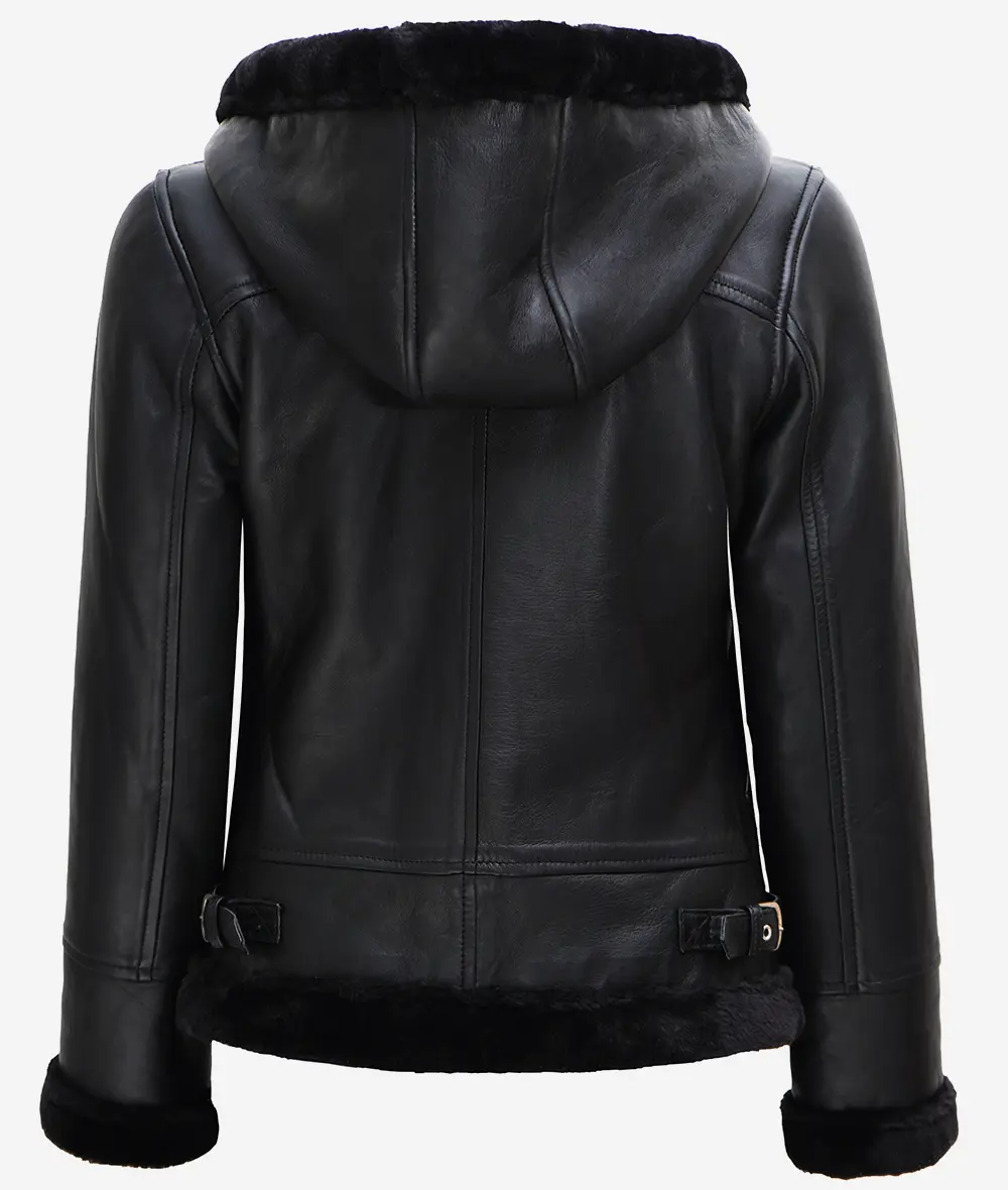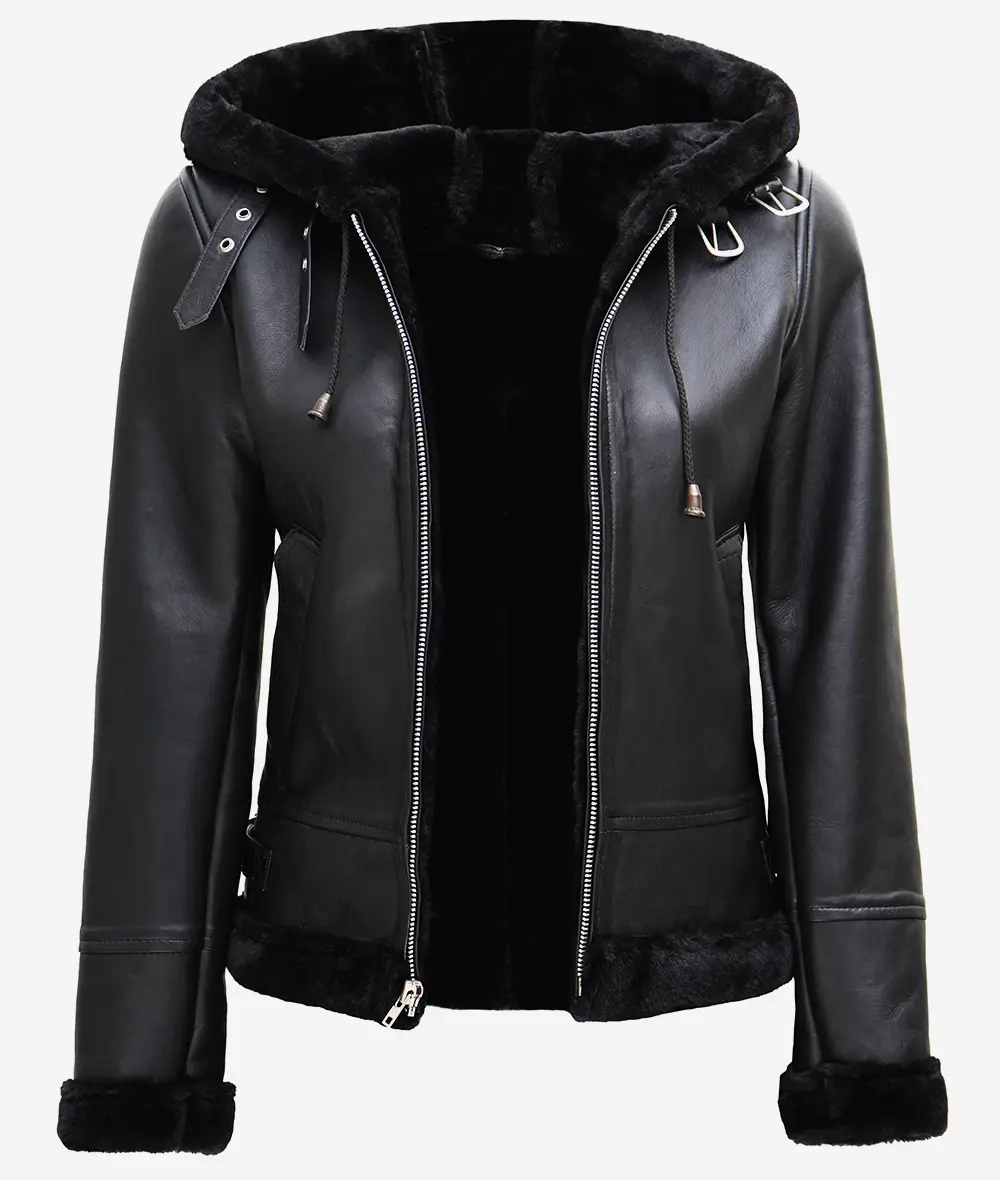 Veste en peau lainée à capuche en cuir noir pour femme