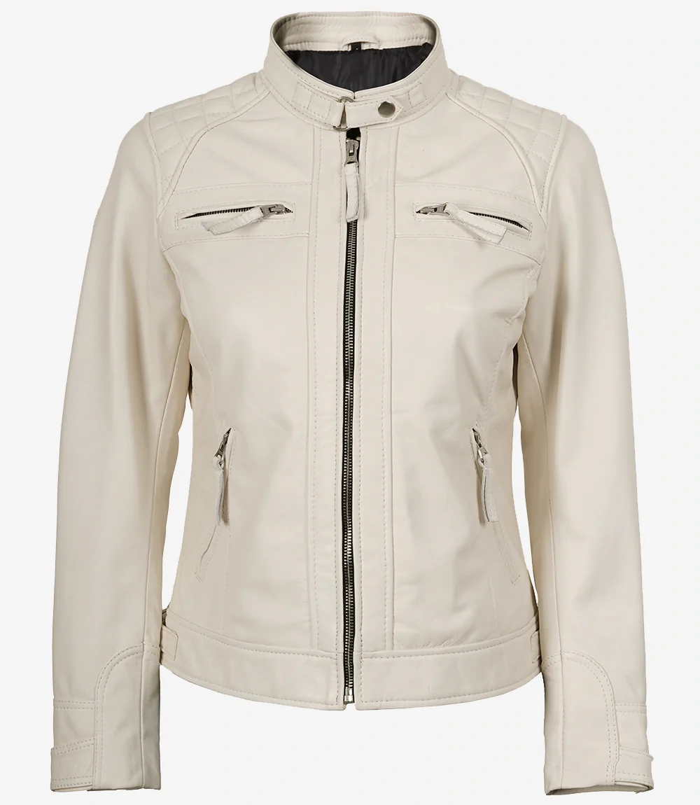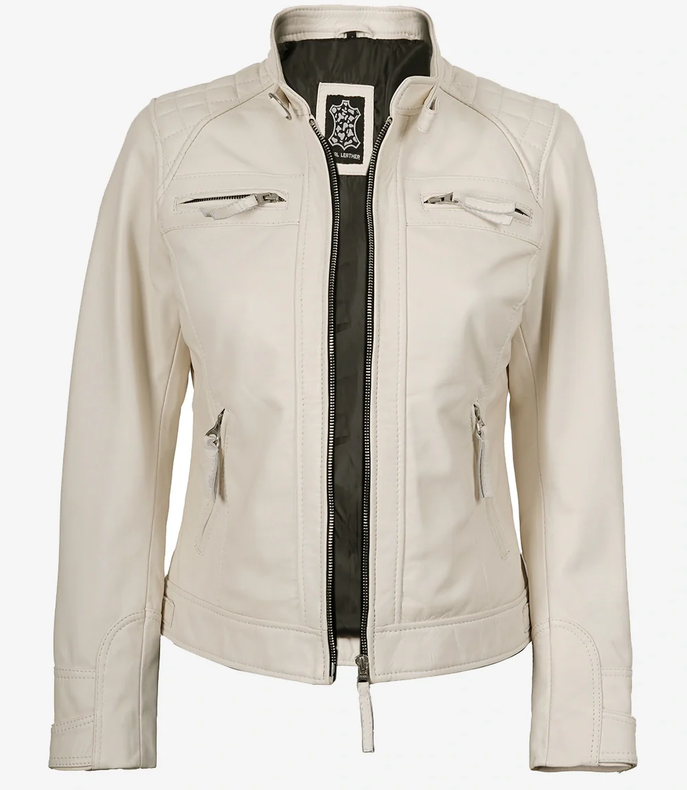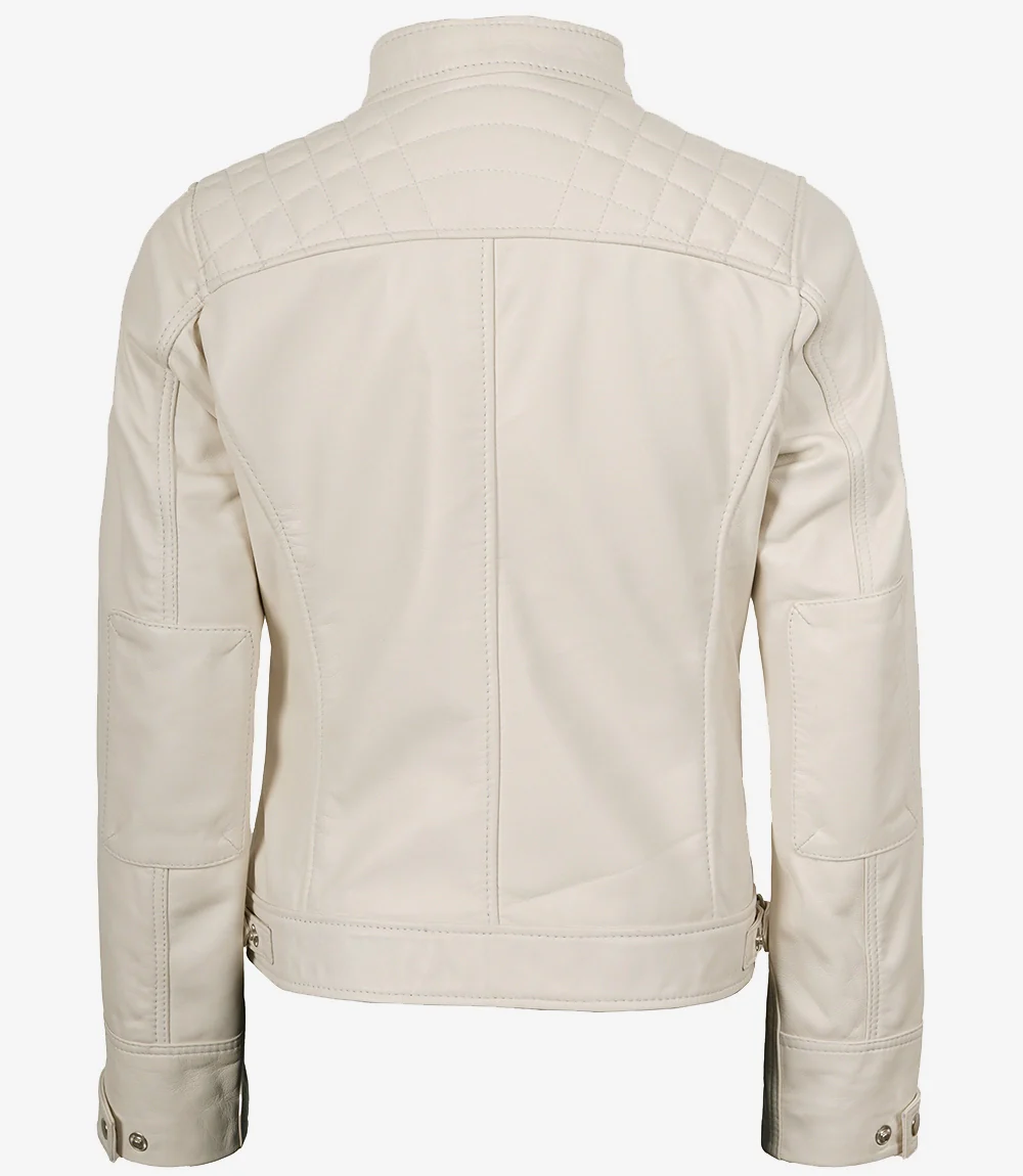 Veste motard matelassée en cuir d’agneau véritable pour femme, blanc cassé