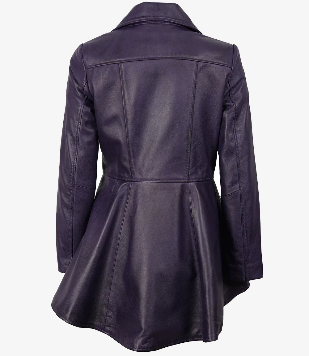 Cette superbe veste en cuir violette style redingote est le complément idéal de votre garde-robe. Confectionnée en cuir souple, légèrement brillant, elle est dotée de larges revers et d’une fermeture zippée sur le devant.