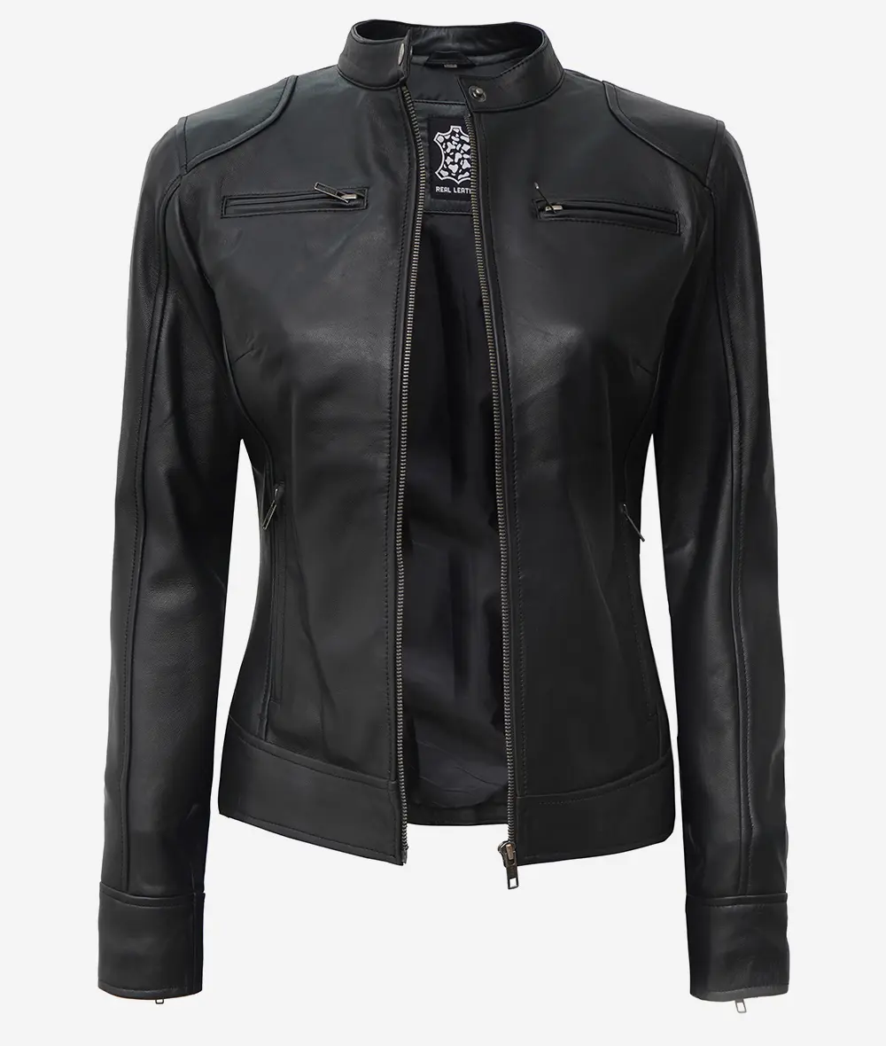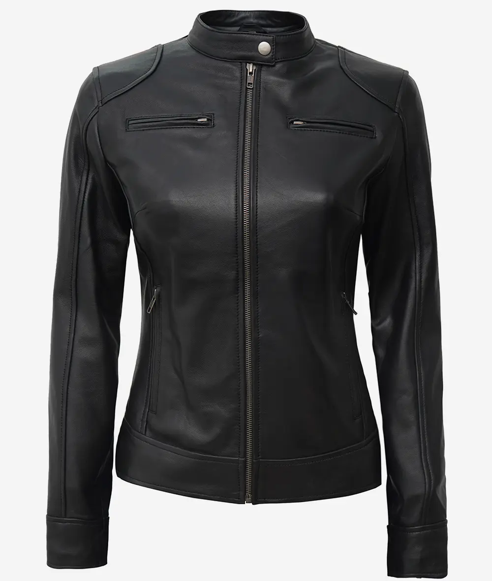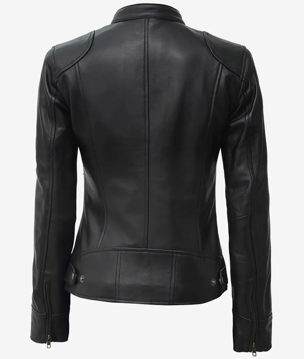 Veste style motard en cuir d’agneau noir pour femme